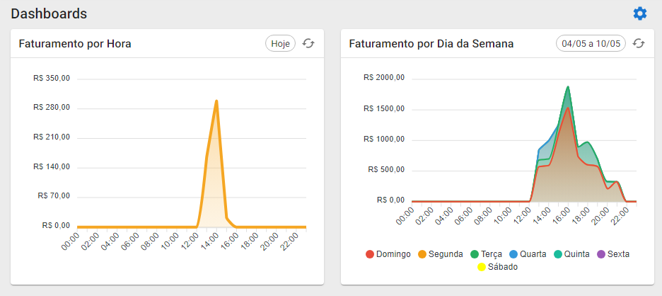 Agora a página inicial do sistema pode apresentar gráficos que permitem ao usuário visualizar quais os dias da semana e hora possuem maior faturamento.