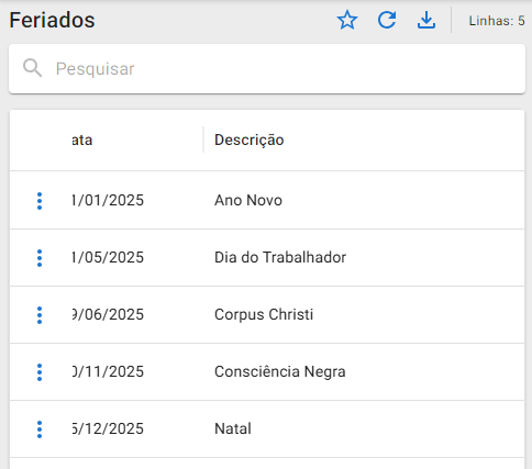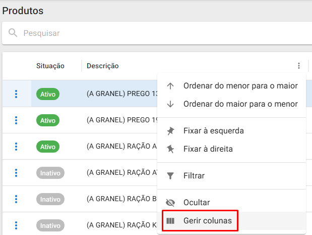 Dica: as colunas apresentadas na Listagem podem ser habilitadas/desabilitadas no ícone de menu (três pontos) que fica visível ao passar o mouse no título de uma coluna. Na opção Gerir Colunas desmarque todas as colunas cuja relevância seja pequena para você.