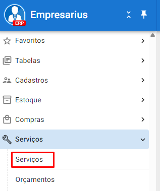 Para manter a localização do cadastro de Serviços mais intuitiva, ele foi movido para o menu Serviços. A mudança visa ainda deixar todas as opções relacionadas aos serviços centralizadas no menu Serviços.