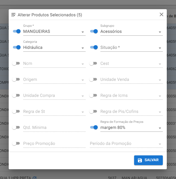 Possibilidade de alterar em massa os campos Grupo, Subgrupo, Categoria, Qtd. Mínima e Regra de Formação de Preços no Cadastro de Produtos.