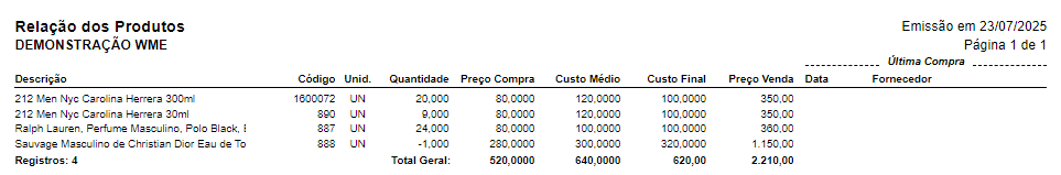 A partir do relatório é possível visualizar informações relacionadas a preços, última compra e quantidade em estoque, além de permitir filtragens por informações como Grupo, Categoria e Gênero.
