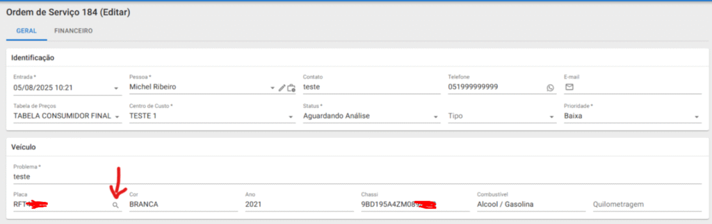 Nas Ordens de Serviço passa a ser possível pesquisar a Placa do Veículo para que sejam preenchidas automaticamente informações como a Cor, Ano, Tipo de Combustível e Chassi.