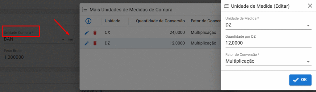 Por exemplo, se você compra um produto às vezes por caixa e outras por dúzia, ambas as unidades podem ser cadastradas previamente. Assim, no momento da entrada, basta selecionar a unidade utilizada naquela compra.